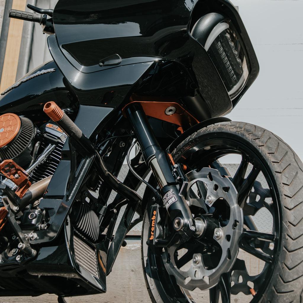 *Tous les modèles, y compris les CVO plus récents, équipés de roues avant de 21 pouces, doivent vérifier le dégagement roue avant/aile avant de rouler. La barre de sécurité peut ne pas se dégager à pleine course. Veuillez vérifier les autorisations avant de rouler. Nous vous suggérons d'utiliser notre kit d'aile de Bagger court en fibre de carbone , des extensions de fourche de 1'' et/ou des ressorts/cartouches de fourche plus rigides pour une réparation facile. N'hésitez pas à nous appeler si vous avez des questions.