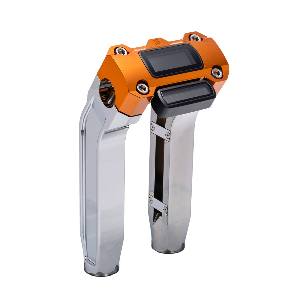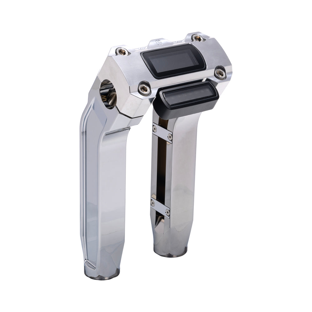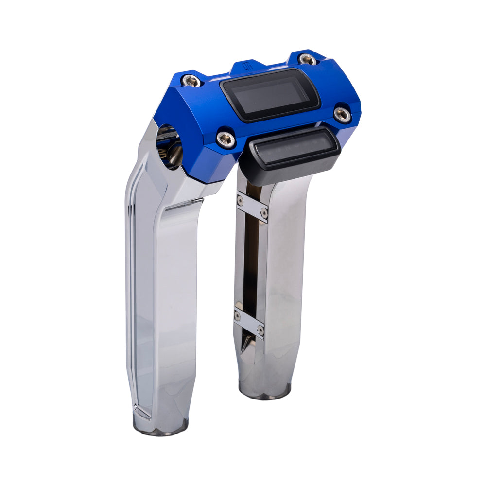 Nos élévateurs modulaires présentent une conception en 3 pièces qui permettent au motocycliste de choisir entre un élévateur rétracté ou droit et 3 hauteurs d'élévation différentes. Il comporte également des rainures intérieures usinées depuis la zone de serrage jusque dans les colonnes montantes à l'aide de petits couvercles en aluminium usiné CNC inclus pour cacher les fils de commande à l'intérieur pour une installation plus propre.