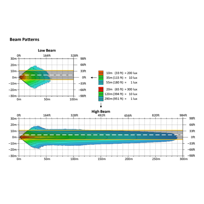- Feux de route : 9080 lm bruts, 4485 lm effectifs (4 LED à réflexion directe)
