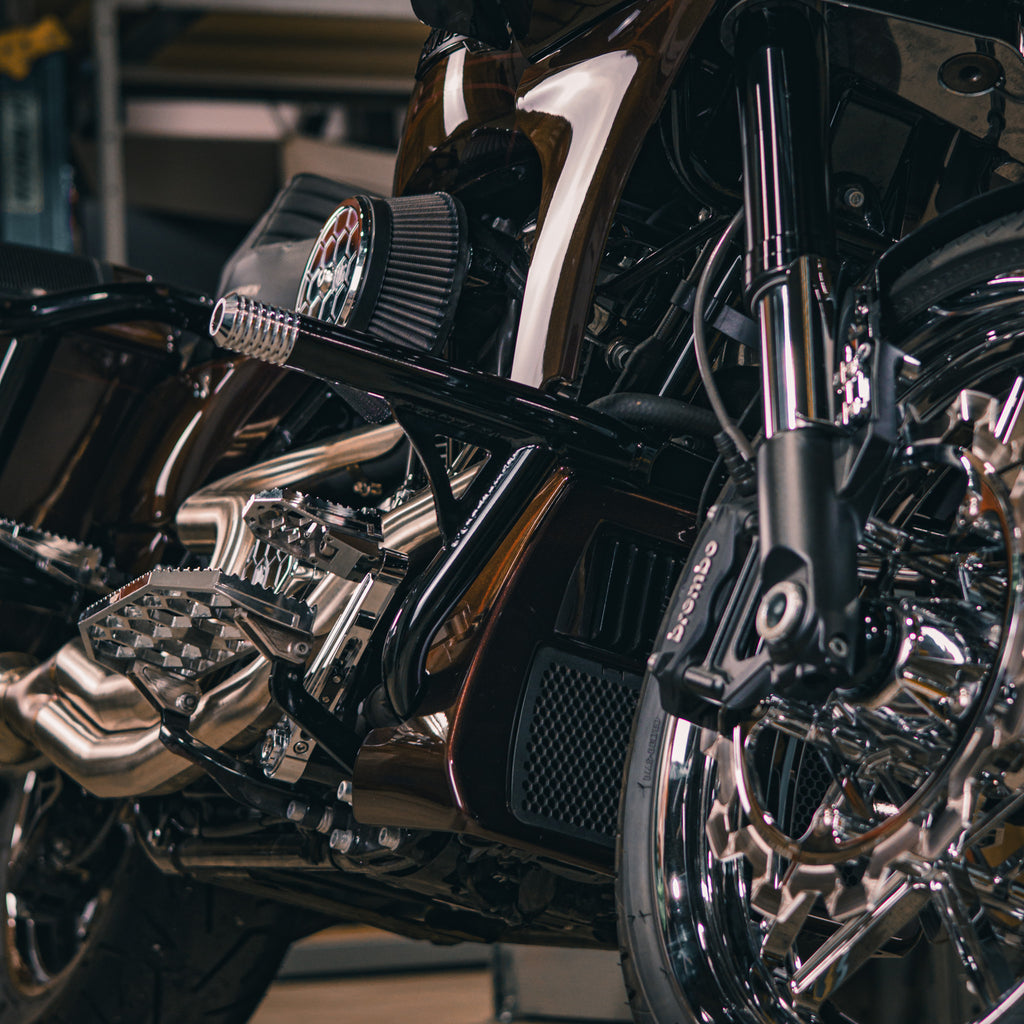 Our Bolt-On OG Highway Peg Crash Bar for 2024-Up Harley-Davidson Bagger will keep your bike protected from tip-overs. Pair it with our OG Rear Crash Bar for Harley-Davidson Bagger for complete protection and a matching look. Fully TIG-welded and assembled in North America, these crash bars were built to last. CVO Side Fairings Spoiler for 2023-Up CVO Road Glide models. These Crash Bars are available in both black powder coat & chrome finish. Sliders are available in all colors that will match all our OG Hard Parts.